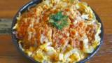 ③小さめのフライパンにごま油を熱し、溶き卵を加えスクランブル状になるまで素早く混ぜる。混ぜたら一旦別皿に移しておく。