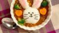 ⑤お皿に成型した②を盛り、④をのせる。仕上げにスライスチーズと焼きのり、ケチャップで顔をつける。