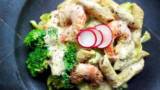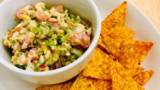 ➁ 大葉2枚をのせ、上にきゅうり、アボカド、人参、ささみをのせて、手前を折り、両端も折って、最後まで巻いて完成。