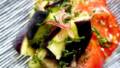 1〉茄子を厚めの輪切りを5枚取れる位に切り分け皮の部分に数カ所切れ目を入れる。切れ目があると箸でも食べやすいです。ヘタと下の近くの円が小さい部分は 1cm角のコロコロに切る。