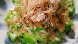 茹でオクラ (材料)2人前 ・オクラ 6本 ・かつお節 1袋 ・しょうゆ 適量(作り方) 1.オクラのヘタにある額部を包丁で削ぎ取り、ボウルに入れて塩揉みする。 2.沸かした湯の中にオクラを入れて中火で1分茹でる。 3.オクラを薄... 2020.11.14野菜のおかず