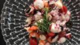 ⑥キッチンペーパーで油をふきとり、中火で熱したフライパンにオリーブオイルをひき、②を香りが立つまで炒める。