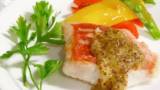 2〉お皿に刺身とふのりを盛り付け胡麻ダレをかけ、好みの青味を散らす。