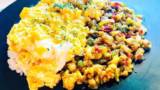 ③牛もも薄切り肉はフライパンで焼き、焼肉のタレを絡ませて細かく刻む。
