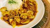 ③フライパンにしじみ、エビ、白ワインを入れて蓋をし中火にかける。しじみの口が開き、エビに火が通ったら火から下ろしザルにあげる。