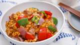 ⑥⑤に④を加えて全体に油がまわるまでさっと炒めて火を止め、ソースを加えて手早くまぜあわせ器に盛る。好みで黒こしょうをふる。