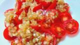 2.ササミを薄くスライス、トマト、バジルをまぜ、上からオリーブオイル・塩・こしょう
