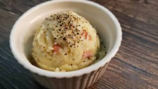 絶品ポテトサラダ 容器に皮剥いたじゃがいも正味280g、玉葱1/4個50g、にんにく2片、水大3入れラップし600w6分半チン焼いたベーコン60g混ぜ人肌に冷やし、マヨ大3半、黒胡椒小1、塩小1/3、砂糖小1、味の素6振り混ぜ完成! 2020.10.17献立