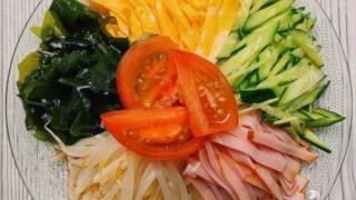 簡単な冷やし中華 《材料》 ◎具材 ▪︎ロースハム 3枚 ▪︎きゅうり 1本 ▪︎もやし 150g ▪︎トマト 半分 ▪︎卵 1つ ▪︎カットわかめ ふたつまみ ▪︎中華麺 1袋 ----... 2020.10.21麺・パスタ